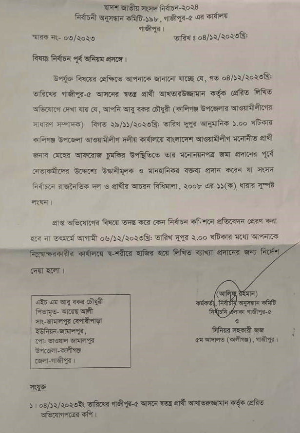 কালীগঞ্জে উস্কানিমূলক ও মানহানিকর বক্তব্য, আ.লীগের সাধারণ সম্পাদককে তলব