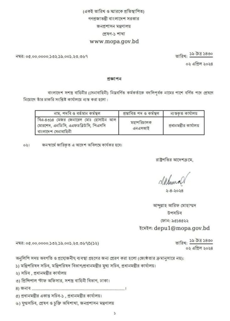 এতে বলা হয়েছে, সেনাবাহিনীর মেজর জেনারেল মো. হোসাইন আল মোরশেদকে এনএসআইয়ের মহাপরিচালক (ডিজি) পদে প্রেষণে পদায়ন করা হলো। জনস্বার্থে জারিকৃত এ আদেশ অবিলম্বে কার্যকর হবে।